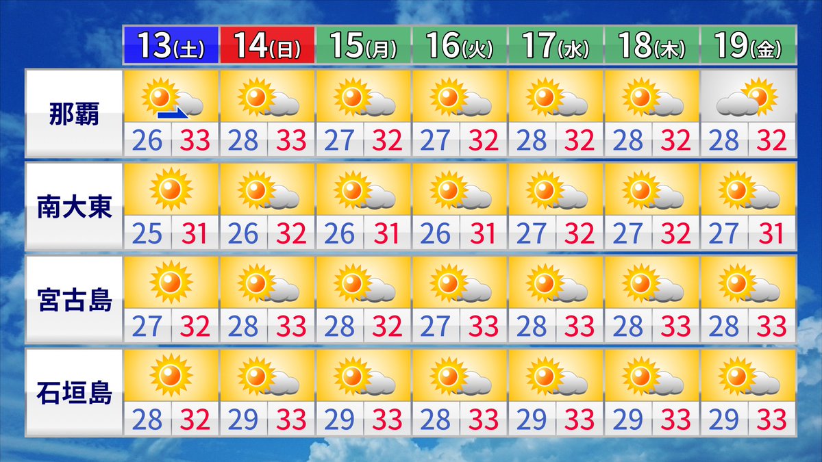 今後1週間程度は概ね晴れて、真夏日・熱帯夜が続きます。暑さ対策を万全にして